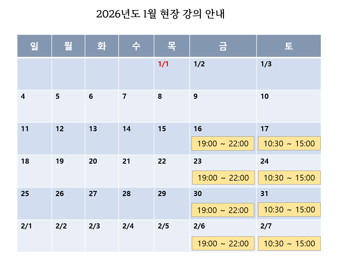 2026년도 1월의 현장강의의 경우 10인 이하의 인원으로 소규모로 진행되며 ,